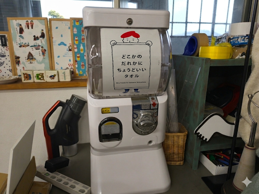 今回の展示にあわせて準備している新しい取り組みが、「もったいない」を遊び心に変えた、初の「タオルガチャ」です。