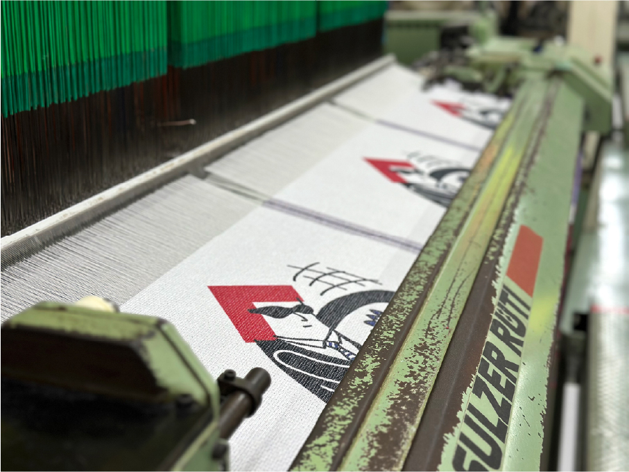 展示を彩るタペストリーは、あえて紙の印刷ではなく、自社の織機で織り上げています。