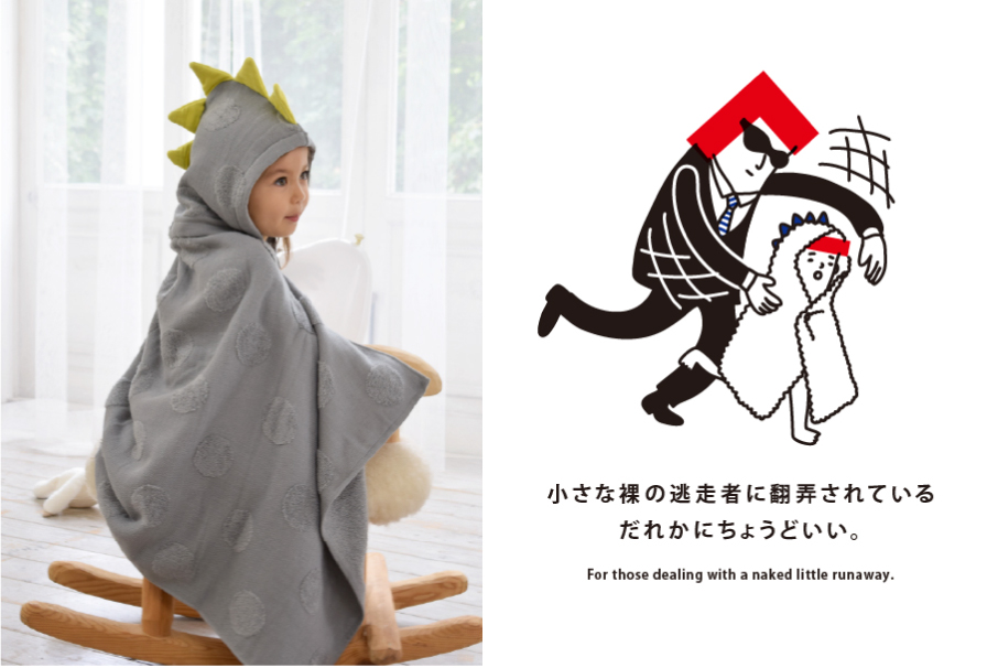 出産祝いの定番品としてロングセラーにもなっているこのフード付きバスタオルは、お風呂上がりに裸のまま駆け出す我が子を思い浮かべて作りました。